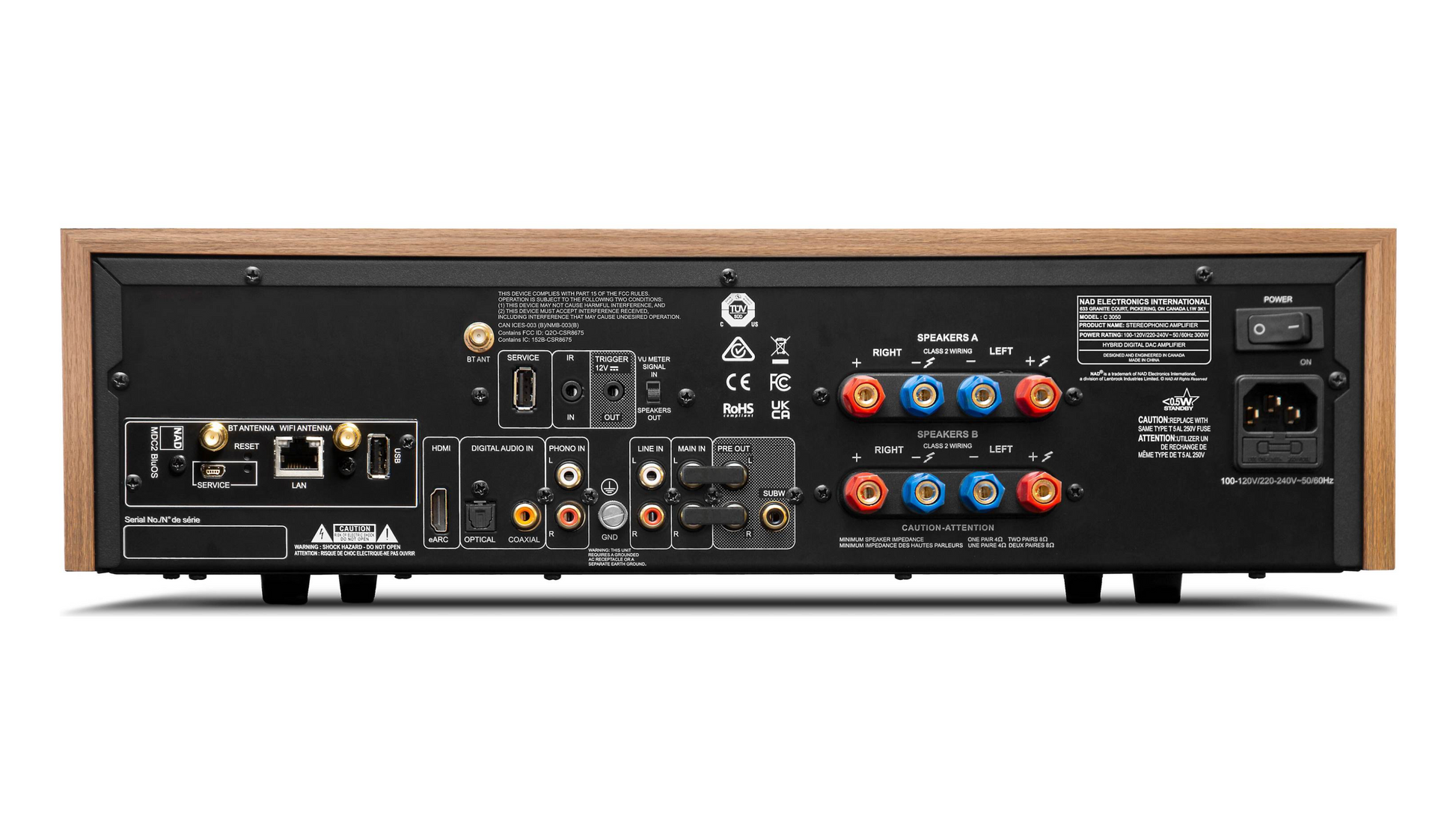 In the C 3050 Stereophonic Amplifier, NAD’s 50-year history of innovation meets the future of hi-fi. With its dual VU meters, push-button input selectors, walnut-finished vinyl-clad cabinet, and 1970s cursive-style branding, the C 3050 recalls the components that helped a generation of music-lovers discover the joys of great audio. With its 100-watt-per-channel HybridDigital UcD amplifier and Texas Instruments high-resolution differential DAC, the C 3050 delivers sound that will thrill today’s discerning listeners. And thanks to NAD’s MDC2 future-proofing technology, C 3050 owners can add leading-edge capabilities like BluOS high-resolution multi-room streaming and Dirac Live room correction.
